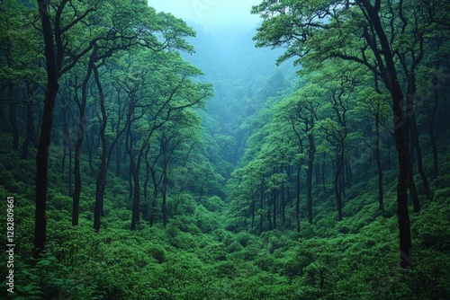forest, tree, jungle, green, nature, wood, lush, plant, leaf, landscape, view, evergreen, dense, vegetation, mountain, vale, path, deep, tranquil, calm, misty, foggy, scenery, foliage, tree, canopy