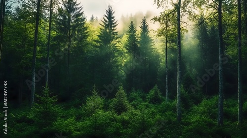 Dense misty coniferous forest with sunlight rays filtering through tall spruce and fir trees creating dramatic atmospheric lighting in temperate woodland ecosystem