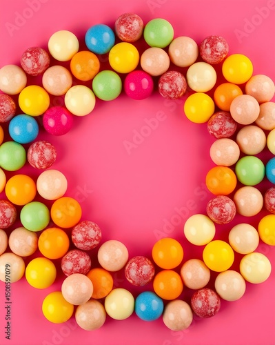 Dense ring of colorful glossy gumballs on a bold pink backdrop creates a fun and energetic composition, ideal for sweet-themed promotions or design elements