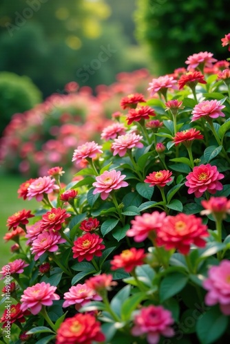 Dense thicket of ornamental shrubs in full bloom, flowering plants, garden decorations
