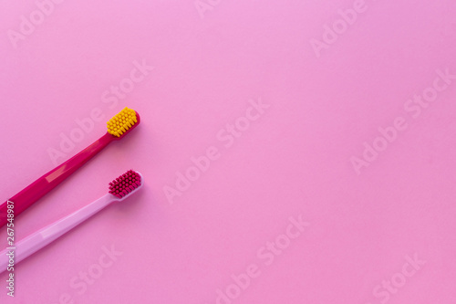 Dental hygiene - tooth brushes flat lay, top view, copy space, pink background