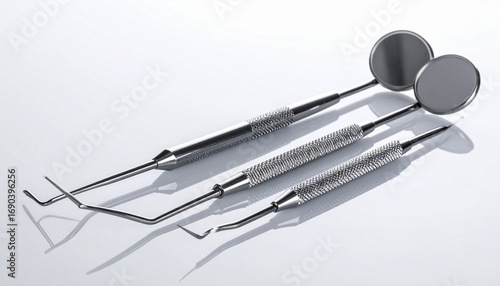 Dental Instrument Trio: A close-up shot of essential dental instruments, reflecting light with precision, ready for a professional oral healthcare session.