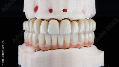 dental prostheses of the upper and lower jaw on models in bite on a black background