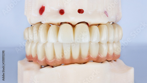 dental prostheses of the upper and lower jaws with gums on models with a light background