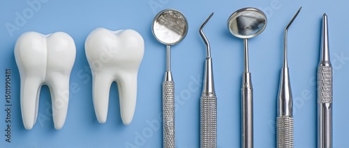 Dental tools and tooth models on blue background.