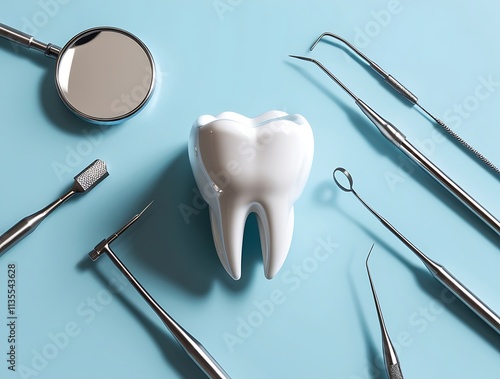 dental tools, oral hygiene, dental care, tooth model, equipment, close up shot on teal background