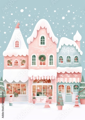 christmas, snow, colours, illustration, house, tree, window, christmas tree, pastel, winter, decoration, holiday, building, christmas decoration, architecture, celebration, cartoon, minimal, cute, hand, art, person, plant, snowy, store, city, food, pink, bright, human, sweet, department, festive, building exterior, confectionery, village, snow-covered, wonderland, playhouse, tradition, whimsical, snowfall, snowing, season