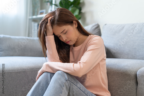 Depression in teenage concept, Young women covering her face feeling anxious and unhappy lock themselves at home sad emotional alone, and have mental disorders.