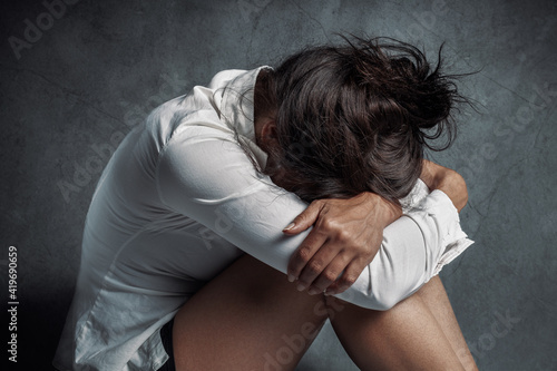 Depression or domestic violence concept: Sad lonely young woman crying while sitting on the floor in a dark room with an attitude of sadness and boredom with her legs together and hugged.