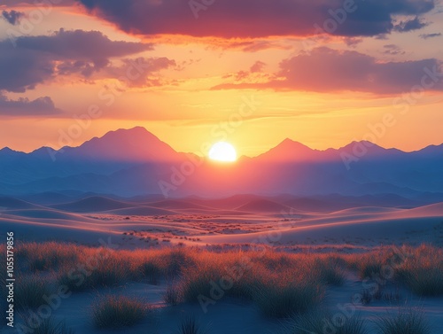 Desert Dunes at Dusk, sweeping golden sands under a vibrant sky, intricate shadows and textures create a mesmerizing landscape