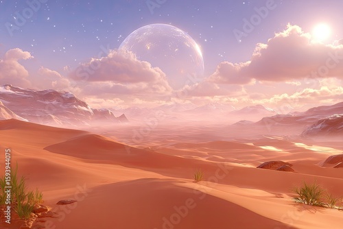 desert, landscape, mountain, sun, cloud, moon, alien, pastel, colours, sand, dune, nature, scenic, sunrise, sunset, horizon, sky, star, warm, light, dreamy, fantasy, digital, art, illustration, three-dimensional, amazing, beautiful, peaceful, huge, wide, open, orange, red, pink, yellow, grass, vegetation, rock, fog, mist, glowing, exotic, imagination, fiction, unique