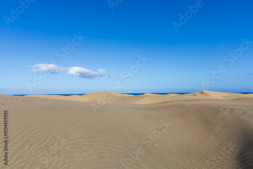 Desert landscape and sand dunes in Maspalomas. View of dunes and sea. Gran Canaria Island Spain