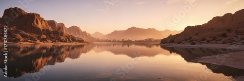 Desert landscape with reflections on Al Qudra lake at sunrise, Morning Light, Reflections, Desert Landscapes