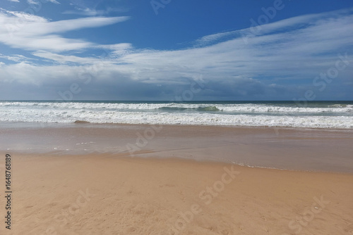 Deserted sandy beach with waves and cloudy sky. Tranquil seascape photography.
