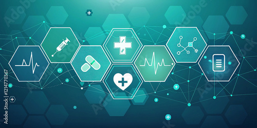 Design healthcare, science, and medicine background with hexagons. Genomics, molecular structure, chemical engineering. Concept of innovation technology.