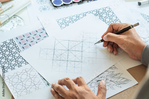 Designer designing drawing sketch pattern geometric flower seamless wallpaper fabric textile fashion industry. artistic design studio..