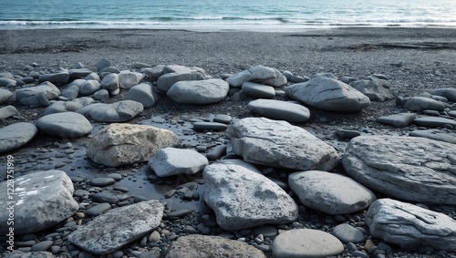 desolate, front view, coastal, beach, rocky shore, minimalistic, calmness, isolation, nature, landscape, serene, picturesque, ocean, advertising, promotional, photo, grey, stone, water, wave, calm, scenic, empty, horizon, abstract, environment, travel, visual, background, peaceful, branding, marketing, aesthetic, rugged, beauty, element, coastline