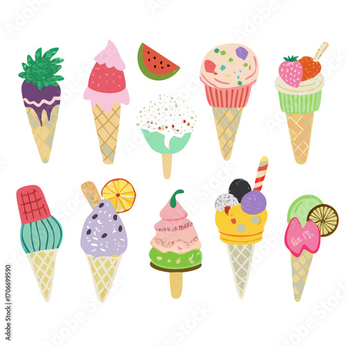 ice, cream, cone, food, ice cream, sweet, dessert, vector, chocolate, illustration, ice cream, cold, summer, candy, delicious, strawberry, ice cream, vanilla, set, glacé, tasty, icon, favor, sugar, fruit