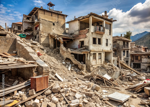 Destruction of buildings and debris create haunting scene of devastation, showcasing aftermath of disaster. remnants of once stable structures are now in ruins, evoking sense of loss and despair