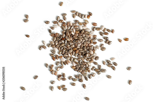 Detail macro closeup photo of spilled chia seeds (Salvia hispanica) isolated on white background shot from above.