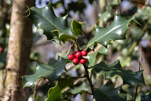 Detail of a branch of holly with red berries