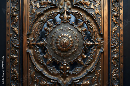 Detail of metal door with traditional islamic ornament. Copper window shutter with antique and national moroccan floral pattern. Oriental ornaments with artistic with chasing for brass