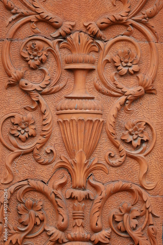 carving, facades, old, building, decorated, ornate, floral, design, stone, sandstone, gothic, closeup, detail, pink, blood-red, victorian, vase, ornamental, italian, renaissance