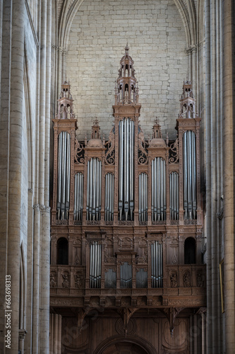 Detail of the large musical organ inside the cathedral Saint-Julien du Mans