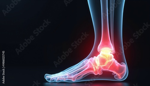 Detailed 3D illustration of human ankle joint structure. Visible bones highlighted areas indicating pain or injury, cartilage ligament, tendons. Medical, healthcare concept, anatomy, skeletal system.