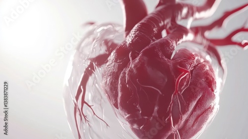 Detailed 3D render of a human heart within a translucent casing, showcasing its intricate structure and blood vessels.