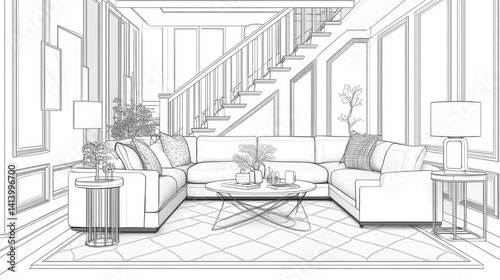drawing, architectural, design, living, room, interior, modern, contemporary, furniture, sofa, sectional, hot drink, table, lamp, plant, decor, detail, plan, vignetting, line, black, white, scheme, layout, home, designing, architecture, stair, lighting, element, space, arrangement, accent, artwork, decoration, pattern, texture, material, visualisation, sketching, concept, rendering, perspective, designer, image, outline, blueprint