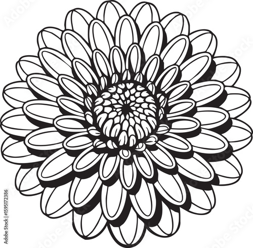 Detailed black and white line drawing of a dahlia flower in full bloom