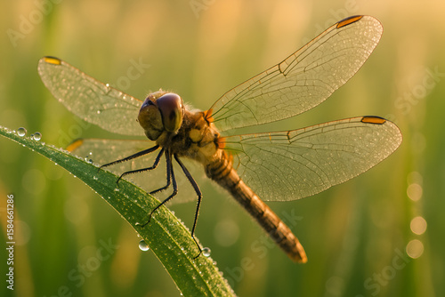 dragonfly, insect, nature, natural, closeup, macro, dew drops, water droplets, wet, fresh, clean, purity, grass, greengrass, plant, environment, ecology, wing, detailed, intricate, delicate, morning, sunrise, golden hour, warm light, sunlight, bokeh, blurred background, no people, animal, wildlife, serene, tranquil, peaceful, summer, spring, light
