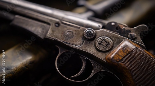firearm, antique, gun, weapon, vintage, handgun, detail, closeup, handle, trigger, mechanism, metallic, aged, security, protection, historical, retro, equipment, criminal, steel, wood, brown, metalwork, engraved, danger, design, nobody, old, dark, armoury, battle, rifle, object, tool, shooting, rustic, defense, heritage