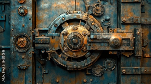 vault, door, antique, metal, texture, design, security, mechanism, lock, aged, background, industrial, blue, brown, surface, pattern, photo, vintage, element, hardware, circular, feature, strong, architecture, construction, detail, ancient, retro, classic, sturdy, craftsmanship, safe, intricate, strongbox, shadow, lighting, composition, rust-eaten, worn, closeup, depth, framing, unique, visual, engineering