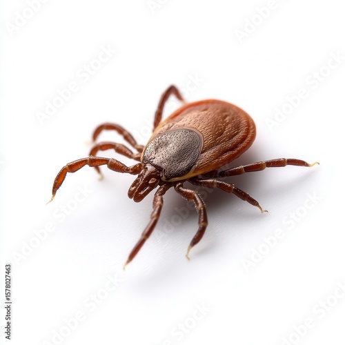 Detailed close-up of brown deer tick on white background showing parasitic arachnid that transmits Lyme disease in medical research context with free copy space