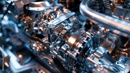Detailed close-up of car engine and transmission system, showcasing intricate parts and components