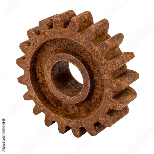 Detailed close-up of corroded metal gear with aged teeth, symbolizing industrial wear and time.