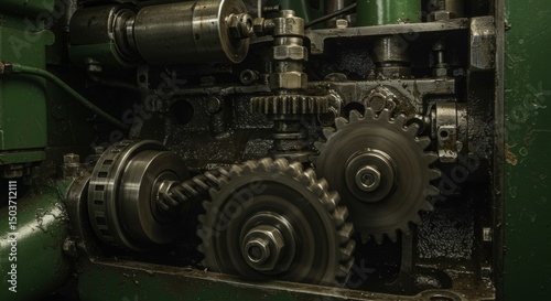 gear, mechanism, cogwheel, machine, engineering, industrial, metal, technology, mechanical, precision, teamwork, industry, part, machinery, equipment, system, connection, metallic, steel, manufacturing, cog, drive, power, design, construction, operation, transmission, process, production, innovation, automation, component, rotating, complex, motion, inside, structure, closeup, detail, vintage, antique, dirty, green