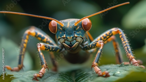 Detailed close-up shot showcasing the vibrant colors and intricate patterns of a grasshopper