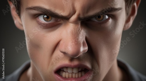 Detailed closeup stock photo of a young adult models face expressing anger, featuring sharp focus on the eyes and mouth, against a neutral background
