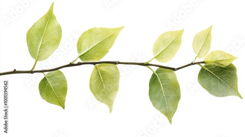 Detailed green leaves on a branch, isolated on a white background, showcasing the intricate patterns and freshness of the foliage