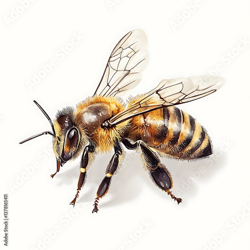Detailed illustration of a honeybee with translucent wings showcasing its striped abdomen fuzzy body and intricate legs on a plain white background.