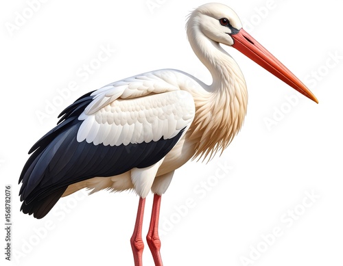 stork, bird, wildlife, animal, feather, wing, profile, white, black, red, orange, long, elegant, nature, portrait, realistic, detailed, side, standing, birding
