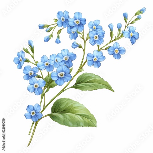 Detailed illustration of forget-me-not flowers with green leaves on a white background, AI generated