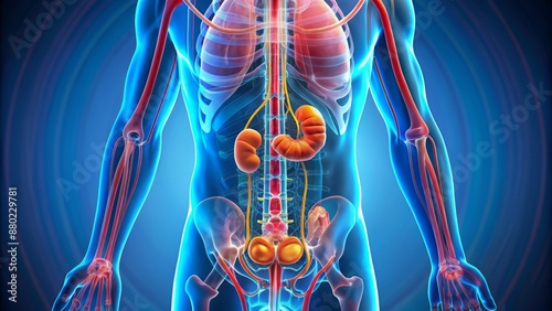 kidney, system, human, anatomy, diagram, illustration, colourful, anatomically, correct, organ, bladder, renal, filtration, excretion, waste, processing, fluid, balance, body, health, medicals, biology, science, education, learning, study, teaching