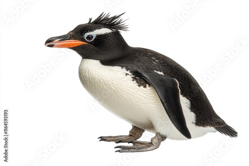 Detailed image of a rockhopper penguin showcasing its unique crest and vibrant orange beak against a plain white backdrop.
