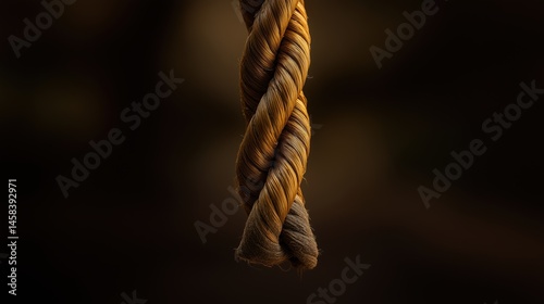 Detailed macro of hanging brown rope with dramatic lighting, rustic strength symbol