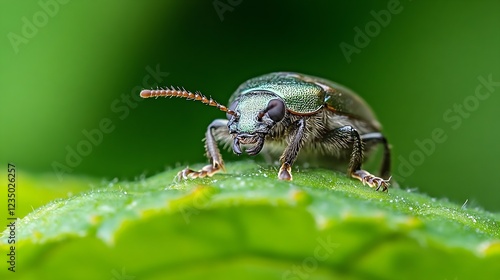 Detailed Macro Photography of Small Green Beetle on Leaf Surface in Natural Environment : Generative AI