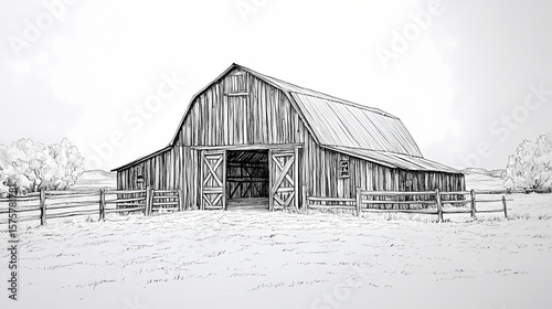 wooden, simple, barn, countryside, detailed, landscape, fence, line, illustration, crayons, white, graphic, drawing, image, scenery, farm, ink, classic, monochrome, rural, structure, vintage, building, black, nature, exterior, design, vignetting, field, tree, pen